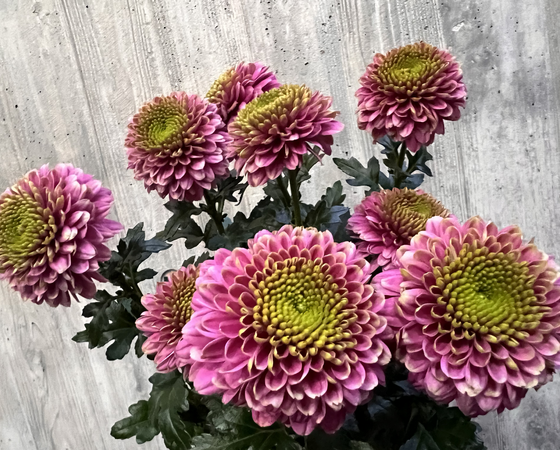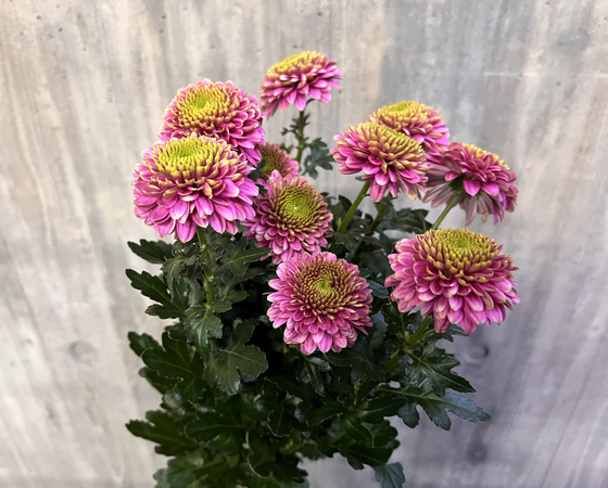 花の形はポンポン咲きで、花色は黄緑とピンクの組み合わせがとても印象的な品種です!