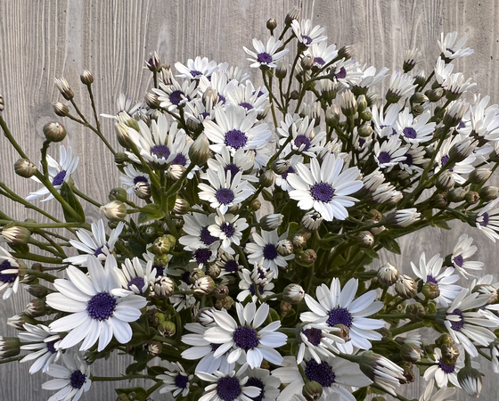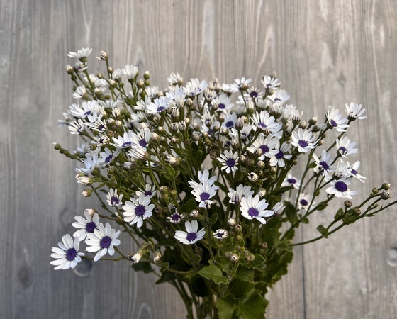 真っ白な花弁と暗い青色の花芯とのコントラストが美しいサイネリアとなっています。