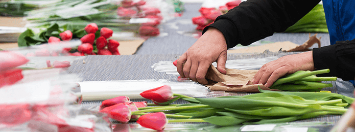 大量生産され、圃場(生産者)から出荷されたお花を、配達するまでの時間を最短で行い、輸送中の温度や湿度の変化、振動に耐えうるようにパッキング材を使用して梱包作業を実施しています。鮮度、品質、生産者の思いを損なわないことを心掛けております。